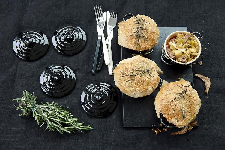 Sådan gør du Låg: Opløs gæren i lunkent vand. Tilsæt olie, salt og fennikelfrø. Rør melet i lidt efter lidt, til dejen slipper, og ælt dejen grundigt sammen på et melet bord. Lad dejen hæve, til gryderetten er klar. Fyld: Skær kødet i tern på 1,5 x 1,5 cm. Krydr det med salt og peber, og brun det på alle sider i olie på en varm pande eller i stegegryden i ca. 15 minutter. Tilsæt hvidløg og røget paprika de sidste par minutter. Kom kødet i en stor gryde sammen med citronskal, rosmarin, vin og vand. Bring gryden i kog, og lad retten simre i ca. 1 time. Skræl kartoflerne, og skær dem i tern på 1,5 x 1,5 cm. Kom dem ned til kødet i gryden, og lad retten simre yderligere 10 minutter, til kød og kartofler er møre. Fjern eventuelle kedelige yderblade på spidskålen, skær stokken fra, og snit kålen i tynde strimler. Vend kålen i retten, når gryden er taget af varmen. Smag til med salt og cayennepeber. Pensl fire ovnfaste skåle, glas eller minigryder med olie på kanten og ned langs ydersiderne. Slå dejen ned, del den i fire stykker, rul dem ud, så de er lidt større end skålene. Fordel gryderetten i de fire skåle, læg dejlågene hen over. Pensl med sammenpisket æg, og drys med fennikelfrø. Læg en lille rosmarinkvist på hvert låg. Bag skålene i ovnen ved 200 grader (ikke varmluft) i cirka 20-25 minutter, til lågene er gennembagte og gyldne. En let grøn salat eller en tomatsalat passer godt til retten.