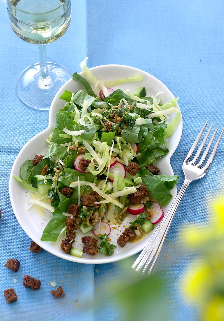 Sådan gør du Snit salat og spidskål i tynde strimler. Skyl og tør strimlerne, gerne i en salatslynge. Vask agurken, flæk den på langs og udkern den med en teske. Skær agurken i små tern. Skær radiserne i skiver. Bland salaten, og anret den på et fad. Rist solsikkekernerne på en tør, varm pande, til de er gyldne. Rør salsaen sammen, og smag den til. Skær rugbrødet i terninger på cirka 1 x 1 cm med skorpe. Varm olien på en pande, kom rugbrød, karry, salt og peber på, og rist ved middelvarme under jævnlig omrøring 5-10 minutter, til terningerne er sprøde. Smag dem til. Ved serveringen: Riv osten over salaten, dryp med salsa, og fordel croutonerne ovenpå.