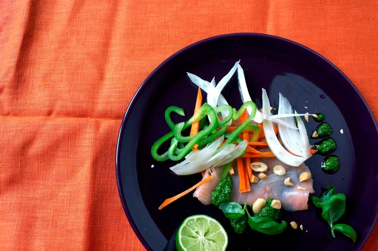 Pil bladene af den friske basilikum (gem lidt til pynt), og blend dem sammen med olie, friskreven parmesan og hvidløg. Hæld peanuts i, og blend, så de stadig er crunchy. Smag pestoen til. Skær fennikel, peberfrugt og gulerødder i tynde skiver/stave. Anret portionsvis med lakseskive nederst, grønsager og pestodryp. Pynt med basilikumblade og hakkede peanuts. Server halve limefrugter til.
