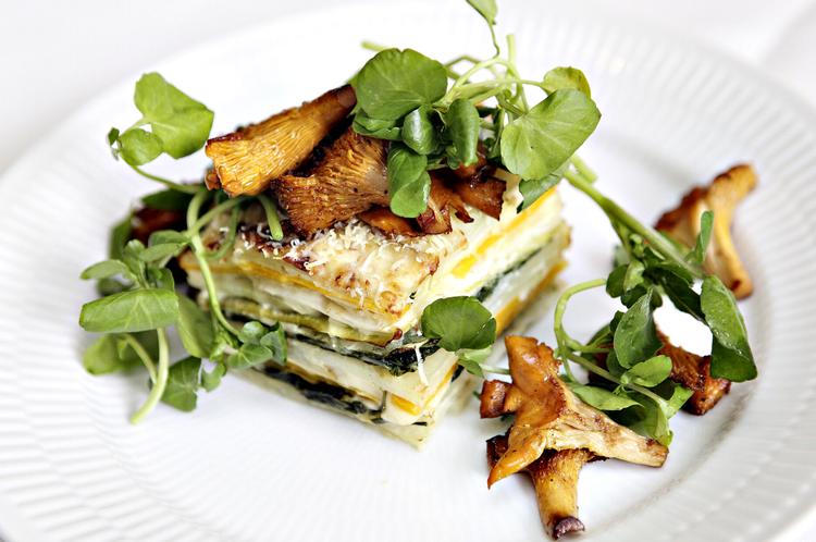 SOVS. Skræl sellerien, skær den i grove terninger, og kog dem i mælk i ca. 20 minutter, til de er helt møre. Blend selleri og mælk med halvdelen af osten samt revet muskatnød efter smag, og krydr med salt og peber. GRØNTSAGSFYLD. Skræl og skyl alle grøntsagerne. Skær kartofler, squash og knoldselleri i helt tynde skiver, og pluk bladene af savojkålen. Skyl spinaten. Snit løget og hvidløget fint, og steg dem i rapsolie ved mellemvarme på en pande. Tilsæt spinaten, og lad det simre i 2 minutter. Smag til med eddike, salt og peber. Smør et ildfast fad i passende størrelse, og læg så først et lag kartofler i fadet, dernæst sellerisovs, squash, kål og et lag af den sauterede spinat. Læg lag på lag, til det hele er brugt. Riv resten af osten på toppen, og bag fadet i 1 1/2 time ved 150 grader. SVAMPETOP. Børst al jord af svampene, og nip det nederste af stokken af. Rist svampene gyldne på en meget varm pande i rapsolie. Skyl brøndkarsen, og pluk det groveste af stilkene fra. Vend brøndkarsen sammen med svampene, og læg dem på toppen. Spis brød til.