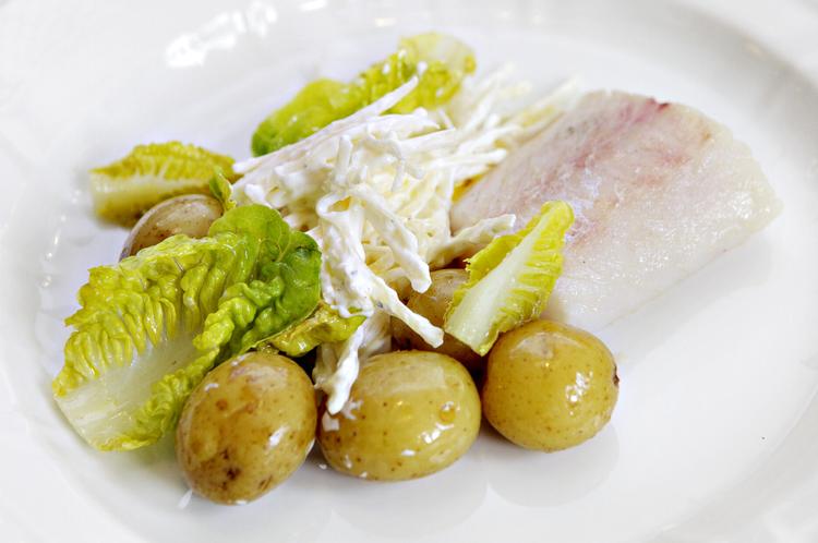 Bland sellerien med de øvrige remouladeingredienser. DRESSING OG SALAT. Pisk ingredienserne til dressingen sammen og smag til med salt og peber. Skyl og pluk salaten i blade, og vend dem godt i dressingen. TORSK. Skær torskefileten i to lige store stykker. Drys kødsiden af fiskestykkerne med salt, sukker og peber, og læg dem på bagepapir smurt med rapsolie med skindsiden opad. Bag torsken ved 120 grader i 20 minutter.