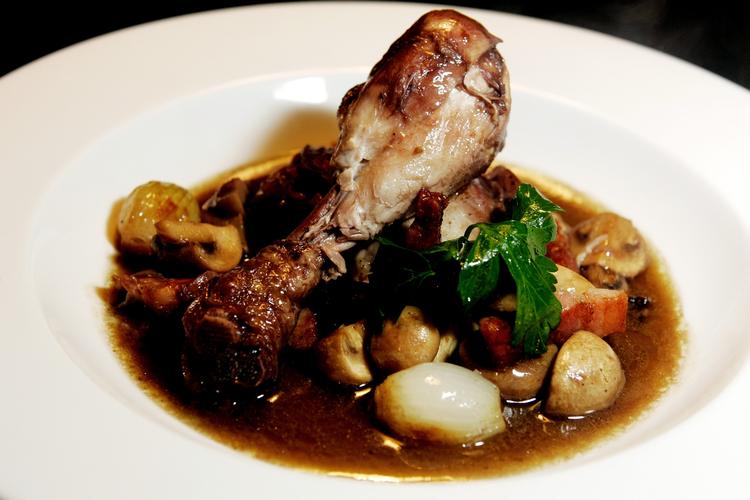 1-2 bornholmske haner 1 liter rød bourgogne evt. lidt god hønsebouillon 2 grofthakkede løg 4-5 fed hvidløg 2 gulerødder i grove skiver 2 stængler blegselleri i grove skiver 4 nelliker 1 spsk. hele peberkorn 1 suppevisk af timian, persillestilk og laurbærblad 200 g bacon 250 g hvide champignoner cirka 16-20 perleløg 2-3 spsk. olivenolie cirka 75 g smør cirka 1 1/2 -2 spsk. mel salt og peber