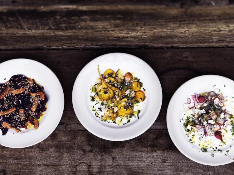 2. Mariner dem sammen med olivenolie, fintrevet citronskal og citronsaft. Vend de gule beder med finthakket purløg og timian, og smag til med salt og peber.