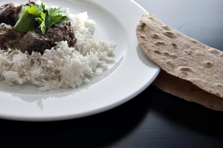 1 kg oksekød (klump eller tilsvarende 1 tsk. salt 2 store spsk. sorte peberkorn, knuste 1 spsk. hele korianderfrø – tørristes separat og stødes i morter 2 tsk. hele spidskommenfrø 1 tsk. fennikelfrø 7 spsk. ghee (klaret smør) eller olie 2 middelstore løg, finthakkede 2,5 cm frisk ingefærrod, rives fint 5 fed hvidløg, rives fint 4 dl kokosmælk (’creamed coconut’ el. fra dåse) 1/2 tsk. stødt gurkemeje 2 friske grønne chili, hakkes meget fint (husk at fjerne frøene) 9 friske karryblade (tørrede kan gå an) 2 strimler usprøjtet citronskræl (kun det gule) 2 spsk. vineddike
