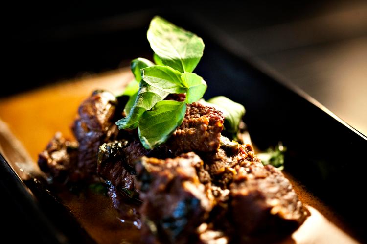 Sæt kødet til side, kom lidt mere olie i wokken, og steg hvidløget, til det begynder at tage farve. Tilsæt 2-3 spsk. af karrypastaen og steg den igennem i et halvt minuts tid.
