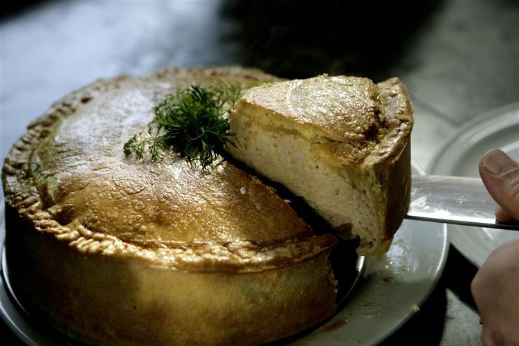 Pisk æggehviderne stive og bland dem med let hånd i farsen. Det skal ikke blandes alt for grundigt. Læg et lag fars i bunden af tærten og derpå halvdelen af de små laksestykker. Derpå endnu lidt fars og ovenpå resten af laksestykkerne. Slut af med et lag fars og luk tærten med dejlåget, som pensles med lidt æggeblomme. Skær et lille hul i midten af dejlåget, så dampen kan slippe ud. Bag tærten ved 180 grader i ca. 45 minutter, til den er gyldenbrun.