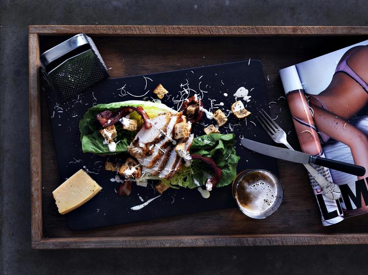 Rør alle ingredienserne sammen til dressingen, og smag til med salt og peber. Skyl salaten, dryp den godt af i en sigte, og skær den i grove stykker. Steg kyllingebryst og bacon, og anret salaten med kylling skåret i skiver, stegt bacon, brød croutoner, revet parmesan og dressing.