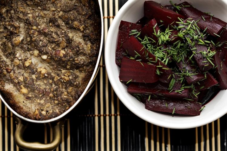 250 g svampe 1 skalotteløg 2 spsk. fløde 100 g hasselnødder 1/2 dl havregryn 2 æg salt og peber evt. lidt hakkede krydderurter 3 mellemstore aflange rødbeder lidt eddike salt hakket purløg