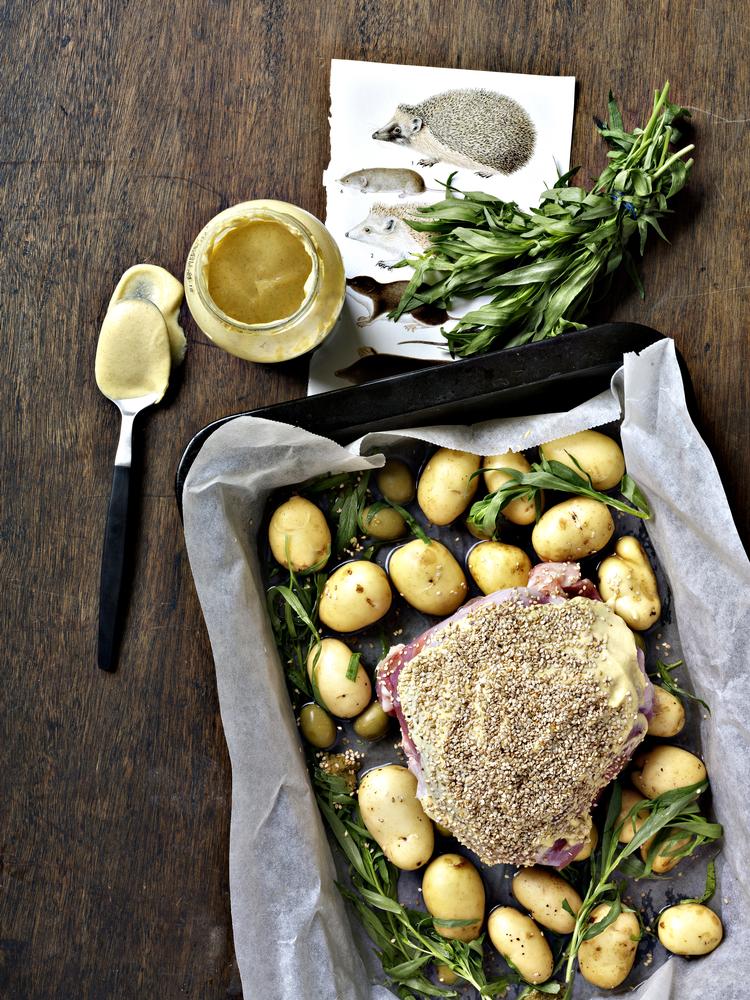 Smør oversiden med sennep, og drys med sesamfrø, salt og peber. Læg det i bradepanden ved kartoflerne. Bag i ovnen (ikke varmluft) ved 125 grader i 3 timer, til kødet er smørmørt. Server med en grøn salat.