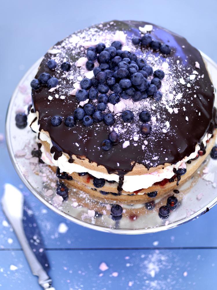 Mos hindbærrene med en gaffel, til de safter, kom 425 g blåbær i, og mos så godt du kan. Pisk fløden til fast skum. Rør glasuren sammen af flormelis, kakao og rom. Læg en bund på et kagefad med den lyse side opad, fordel halvdelen af bærblandingen over, knus 40 g marengs over og fordel halvdelen af flødeskummet over. Gentag. Læg den sidste bund på med den brune side opad.