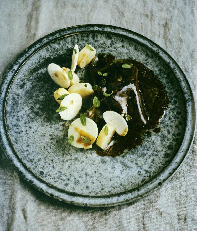 2,5 kg oksehaler i stykker olie til indgnidning salt 250 g rødvin 1,25 kg let hønsefond 125 g mørk øl 1 løg 1 gulerod 1 porre 20 g skalotteløg 1 timiankvist 0,25 citron smør til sautering 1 lille bundt timian 100 g reduceret oksehalefond 35 g brunet smør 5 g stenurtblade 5 g Gellan 500 g økologisk æblejuice 2 stængler jernurt, gerne små blade 500 g store jordskokker 50 g balsamisk æbleeddike lidt smør 1 stort mutzuæble eller to mindre