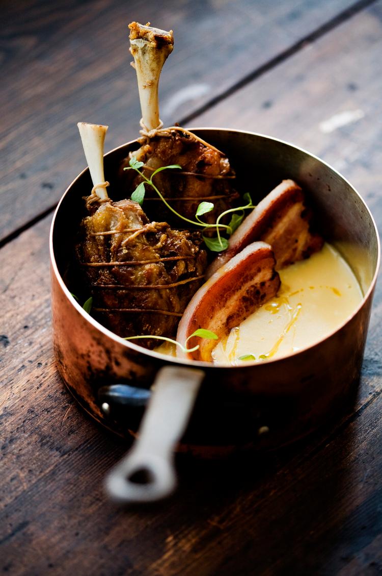 Fisk kød og bacon op af gryden, når trykket er lettet, og blend resten af ingredienserne til en cremet suppe med en stavblender. Dup spolebenene tørre, og brun dem grundigt af på alle sider. Her er det en fordel, at de er bundet op med kødsnor, da de ellers kan falde fra hinanden. Det kan man nemt bede sin slagter om at gøre. Server det hele dampende varmt med et par dråber rapsolie og en klat sennep.