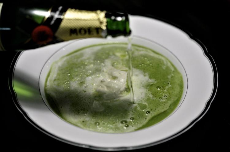 Det er en pureret ærtesuppe, som tilsættes letpisket flødeskum og champagne, og når far ved festlige lejligheder serverede den, var det som regel med let løftede øjenbryn idet han udbrød: –Ja, hvis I ikke kan lide det – så må I ringe efter en ambulance«.