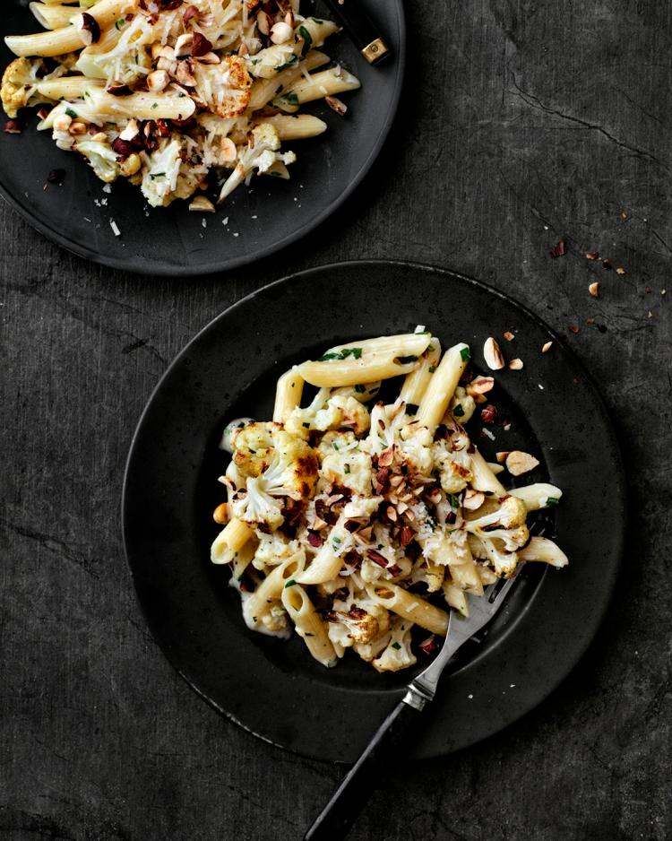 1 blomkålshoved olivenolie 100 g hasselnødder 1 løg 2 fed hvidløg 1/4 l piskefløde 50 g parmesan 1 bdt. bredbladet persille 400 g pasta penne 4 æggeblommer salt, peber