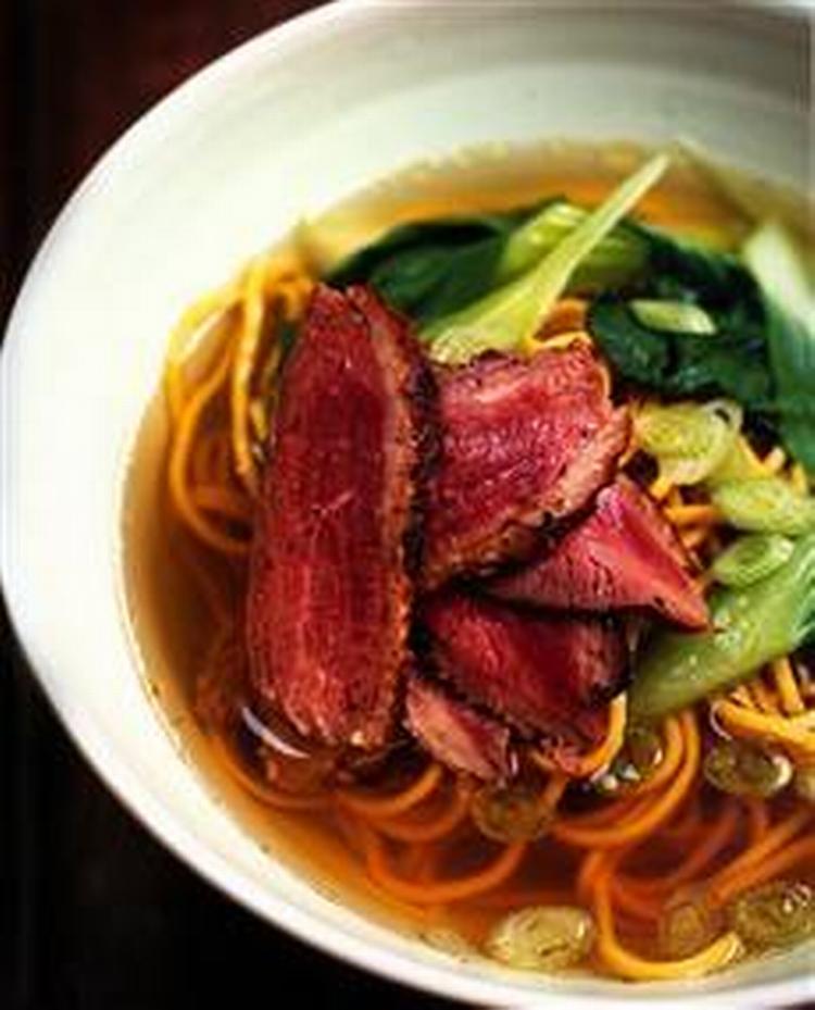 Før servering koges nudlerne i en stor gryde kogende vand i 2-3 minutter, til de netop er gennemkogt. Hæld vandet fra nudlerne og fordel dem i 2 skåle. Bring grøntsagfonden i kog, tilsæt pak choy og kog i 1 minut, hæld det over nudlerne og smag til. Skær andebrysterne i tynde skiver en smule på skrå og arranger skiverne over nudlerne sammen med forårsløgene. NB: Arbejdet lettes, hvis nudlerne er kogt, før retten tilberedes. Ægnudler kan købes hos asiatiske købmænd, bl.a. Den Kinesiske Købmand på Nørre Voldgade, men de fleste store danske supermarkeder har efterhånden også et pænt udvalg af asiatiske specialiteter, bl.a. fra firmaet Blue Dragon. Hvis det viser sig umuligt at få fat på ægnudler, kan de erstattes af andre kinesiske nudler.