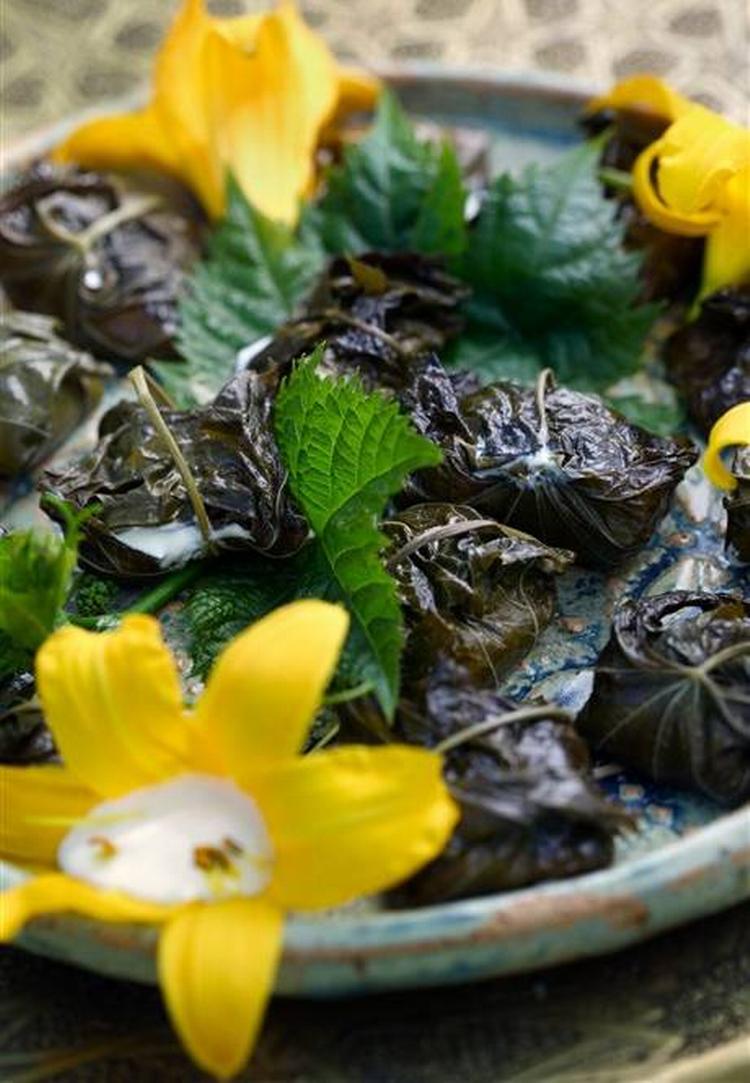 Smør bladene med olivenolie på begge sider med fingrene. Klip stilkene af. Læg en lille skefuld gedeost på hvert blad og klap siderne ind, rul sammen til en lille rulle og læg dem med samlingen nedad, tæt i et lille fad. Fyld friske dagliljeblomster med en lille dut gedeost. Det er nemmest, hvis man kommer osten i en plastikpose og klipper et lille hjørne af, så den fungerer som sprøjtepose.