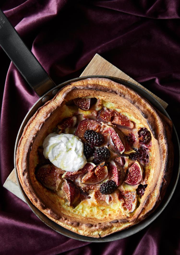 - Tag den hede pande ud af ovnen, og smid smørternene på den. Slyng rundt, så smørret smelter. Hæld roligt dejen i en stråle ned midt i smørsøen, og læg figner og brombær ned i midten. Sæt forsigtigt panden tilbage i ovnen.