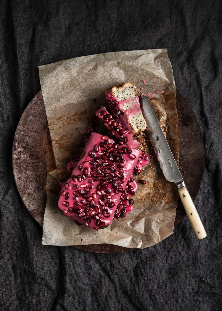 En saftig kage med sprøde birkes og syrlig-sød granatæbleglasur, der forsøder en grå vinterdag.