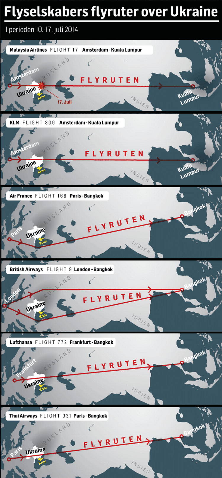 Frem til MH17 fra Malaysia Airlines' styrt tæt på Ukraines grænse til Rusland i går eftermiddags fløj eksempelvis Lufthansa, Thai Airways, Singapore Airlines samt hollandske KLM igennem området.