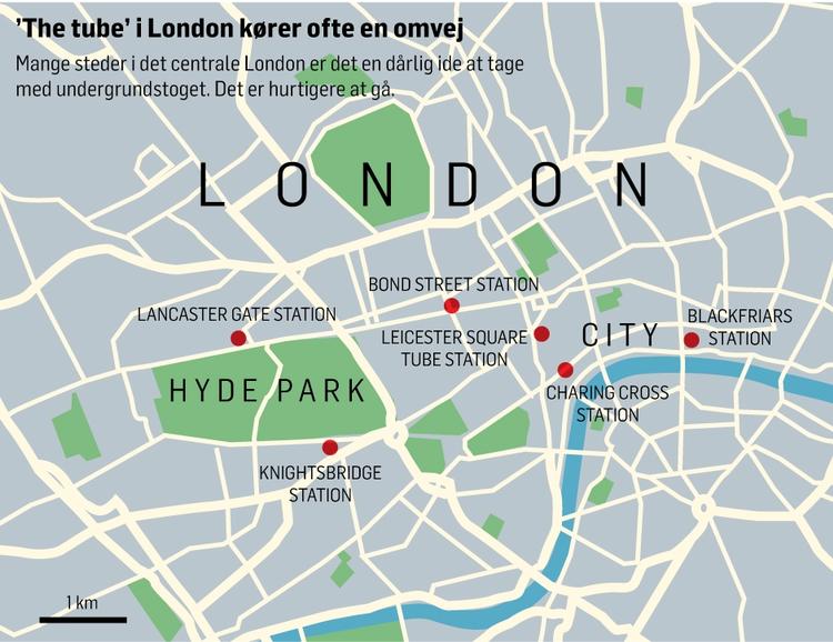 Men det er, hvad Transport for London siger til sine kunder. Og her tænkes nok især på turister, der ikke har indgående kendskab til placeringen af undergrundsstationer i det centrale London. I flere tilfælde er det en dårlig ide at køre med ’the tube’ fra den ene station til anden – det er hurtigere og nemmere at gå oppe på overfladen.