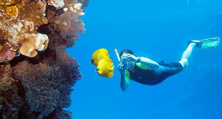 Allerede mindre end et minut efter, jeg er dykket ned under vandet, dukker de første farverige fisk frem. De svømmer langs med, ind mellem eller rundt omkring de lige så farvestrålende koraller.
