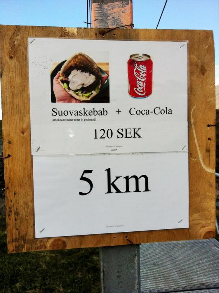 En lugt af brænderøg og stegt røget kød møder os. Det er efterkommere af Laplands oprindelige befolkning, samer, der serverer stegt røget renkød, ’souvas’, i en slags kebab. Prisen afspejler udbud og efterspørgsel i disse tyndt befolkede egne. 120 svenske kroner – men så får man også en dåsecola med. Og det smager fantastisk.