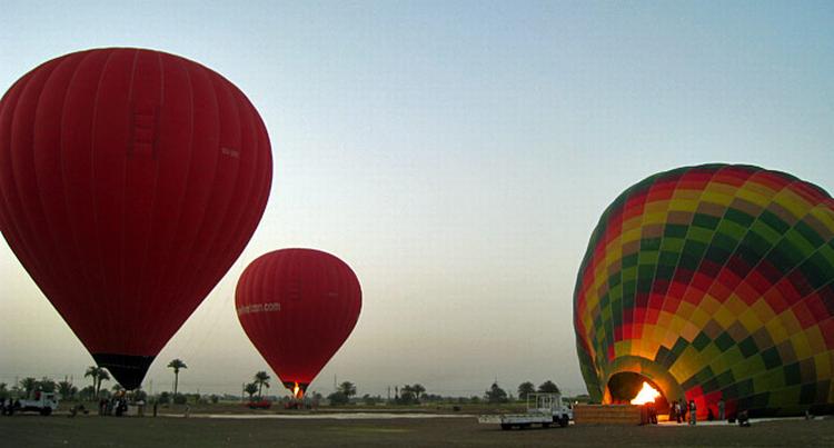 Joan Gualdoni folder hænderne og messer uafbrudt »åh Gud, åh Gud, åh Gud«, mens hendes mand, Cesare Gualdoni, beroligende lægger en arm omkring hende, da vi stiger højt til vejrs. Det amerikanske pensionistægtepar fra South Carolina sidder nemlig ikke trygt og sikkert i en Boeing 747 eller et andet stort passagerfly, men befinder sig i en luftballon over Nilens vestbred ved den egyptiske by Luxor.