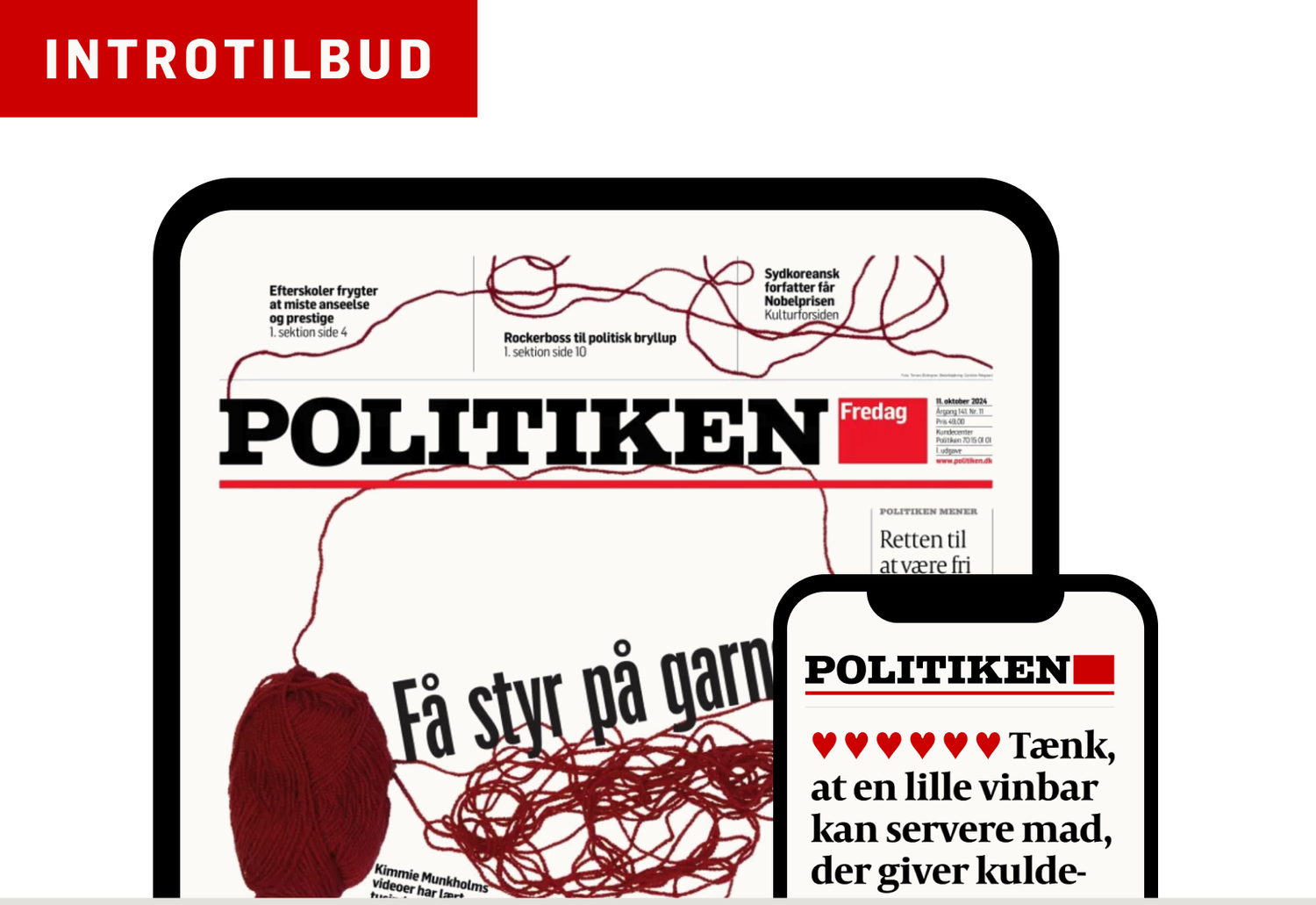 Indtast dine oplysninger Email * Fornavn * Efternavn * Fødselsdato (DD-MM-ÅÅÅÅ) * Telefonnr. * Vælg betalingsmetode Mobilepay Kreditkort Ja, jeg accepterer abonnementsvilkårene Politiken må gerne kontakte mig via e-mail, sms og telefon med tilpassede nyheder og tilbud på print og digitale produkter og tjenester, lyd-, streaming-, kultur- og underholdningstilbud, arrangementer samt mulighed for deltagelse i konkurrencer o.l. fra Politiken og fra udvalgte brands og koncernselskaber i JP/Politikens Hus A/S. Listen med brands og koncernselskaber kan løbende opdateres, så der altid præsenteres relevante og aktuelle nyheder og tilbud. Med mit samtykke accepterer jeg også, at Politiken må behandle mine persondata og indsamle information om min interaktion med markedsføringsmeddelelser (såsom åbning og læsning) ved hjælp af tracking pixels og lignende teknologier. Læs mere i vores privatlivspolitik og cookiepolitik. Samtykket kan altid tilbagekaldes via afmeldingslink eller ved at kontakte kundeservice. Jeg vil gerne opdateres på dagens vigtigste nyheder hver morgen med Politikens morgennyhedsbrev. Mindstepris: 1 kr. – gælder kun, hvis du ikke har abonneret på Politiken de seneste seks måneder. Kan opsiges til udløb af 1. måned. Efter 1 måned fortsætter abonnementet til fuld pris og kan opsiges med løbende måned plus én måned. Priserne forudsætter betaling med kreditkort eller MobilePay. Fortrydelsesret i henhold til forbrugeraftaleloven. Læs mere herNår jeg trykker ”Gå til betaling”, samtykker jeg til, at Politiken igangsætter mit abonnement, og jeg anerkender, at jeg skal betale forholdsmæssigt for mit forbrug frem til en eventuel udnyttelse af min fortrydelsesret. Læs vores privatlivspolitik her. Gå til betaling
