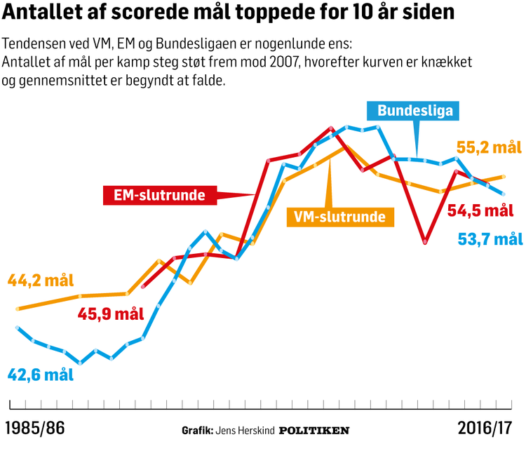 Men det er ikke så ’slemt’, som det har været. Politikens departement for sportsnørderier har været en tur i den støvede talskov og kan dokumentere, at kurven er knækket. Det går muligvis hurtigere, længere og højere i dagens hæsblæsende håndboldkampe, men det giver ikke så mange mål som for 10 år siden. I hvert fald ikke ved VM- og EM-slutrunderne og den daglige tumleplads for hovedparten af verdens bedste spillere, Bundesligaen.