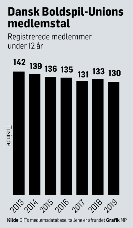 Mens der i 2013 var 142.478 registrerede medlemmer under 12 år i Dansk Boldspil-Unions (DBU) foreninger, er tallet i den seneste opgørelse fra 2019 faldet til 130.113. Det svarer til et fald på knap 9 procent over 6 år.