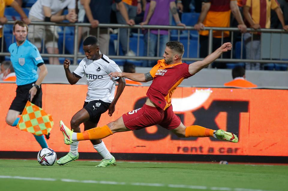 Randers-spilleren Tosin Kehinde forsøger at forsvare bolden, mens Galatasarays Alpaslan Ozturk kaster sig frem i et angreb.