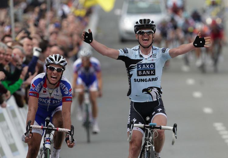 I et åndeløst spændende klassikershow sikrede den 30-årige belgier Nick Nuyens for andet år i træk Bjarne Riis triumfen i Flandern Rundt, da han i en tremands spurt overtrumfede franskmanden Sylvain Chavanel (Quick Step) superfavoritten Fabian Cancellara (Leopard-Trek) efter de 258 km fra brugge til Meerbeke. Cancellara, der havde været finalens lysende hovedperson med endnu en fornem opvisning i aggressiv kørsel, som længe pegede frem mod, at han skulle gentage triumfen fra 2010, måtte erkende, at han i dag var oppe mod overmagten. Cancellara prøvede til det sidste Men samtidig må det konstateres, at den 30-årige schweizer til det sidste forsøgte at gribe ud efter lykken. Med tre km tilbage satte han sin sidste offensiv ind, og kun Nuyens og Chavanel formåede at gå med. De tre fulgtes den sidste strækning, og endnu engang prøvede Cancellara at nedkæmpe modstanderne ved at åbne spurten. Heller ikke denne ultimative satsning var Cancellara imidlertid i stand til at føre succesrigt til ende. Nuyens lå perfekt på hjul, og han gik uden de store problemer forbi schweizeren, mens Chavanel forgæves søgte at hente belgieren. Nuyens på toppen af sin karriere Nuyens, der inden denne sæson kom til Saxo Bank-SunGard, var på forhånd regnet blandt outsiderne, og sejren kommer langt fra som en sensation, eftersom han i ugerne op til Flandern Rundt har vist glimrende form. I forrige uge slog Nuyens til i Dwars door Vlaanderen på en dag, hvor han havde kunnet læse i aviserne, at han af en af hjemlandets eksperter betragtede som en færdig mand. Nu står han på toppen af sin karrieren med det absolut fornemste resultat på generaliebladet. Blev blæst af sted i starten Rytterne blev fra start blæst af sted med vinden i ryggen, og det høje tempo gjorde det uhyre vanskeligt at få etableret et effektfuldt fremstød. På den første time tilbagelagdes 49,7 km, men kort efter dalede farten en anelse, og det benyttede fem mand sig af til at iværksætte den offensiv, der kom til at præge en stor del af løbet. Englænderne Roger Hammond (Garmin Cervélo) og Jeremy Hunt (Sky), hollænderen Stefan Van Dijk (Verandas Williams), australieren Mitchell Docker (Skil-Shimano) og franskmanden Sébastien Turgot (Europcar) fandt sammen, og i feltet var der tilsyneladende enighed om, at de skulle have lov til at prøve lykken. De nåede op på at have knap otte minutters forspring, før der blev reageret bagude. Da det første skete, reduceredes afstanden systematisk, men der var intet hastværk med at hente kvintetten. Prøvede at sætte Cancellara under pres På Oude Kwaremont, da alvoren i løbet så småt begyndte, måtte Van Dijk og Hunt opgivet at følge de tre andre, mens Sylvain Chavanel havde iværksat en solooffensiv. Det var et af flere åbenlyse forsøg på at sætte Fabian Cancellara og Leopard-Trek under pres, men umiddelbart var der ikke optræk til, at det skulle lykkes. Chavanel og australieren Simon Clarke (Astana) nåede op til Hammond, Docker og Turgot på vej frem mod Koppenberg, mens feltet splittedes med blandt andre den belgiske mester Stijn Devolder og Saxo Bank-SunGards trumf Nick Nuyens i den bagerste del. Chavanel angreb alene Der skabtes imidlertid atter samling efter Koppenberg med knap 75 km til mål, og de eneste, der holdt stand helt i front, var Clarke og Chavanel. De to fightede ufortrødent videre, og efter Eikenberg med 62 km til mål fik de følgeskab af nordmanden Edvald Boasson Hagen (Sky) og hollænderen Lars Boom (Rabobank). Molenberg 47 km fra mål brugte Sylvain Chavanel til al at satse alene, men kort efter skete det altafgørende i løbet, da Cancellara lukkede op for turboen. Egentlig var det Tom Boonen, der forcerede, efter at først Thor Hushovd havde skruet tempoet i vejret. Boonen spurtede forbi den norske verdensmester, men med på hjul var Cancellara og italieneren Filippo Pozzato (Katusha). Satsede alt på Leberg Cancellara holdt sig imidlertid ikke længe i skyggen, og mens schweizeren på Leberg med godt 40 km til mål susede forbi Chavanels tidligere ledsagere, som befandt sig på mellemhånd, blev Boonen og Pozzato hængende i det selskab. Det betød, at gruppen, som forfulgte Chavanel og Cancellara foruden Boonen og Pozzato kom til at bestå af Boasson Hagen, Boom samt belgierne Greg Van Avermaet (BMC) og Björn Leukemans (Vacansoleil). De blev dog hentet af et større felt på Valkenberg, men forude var løbet tilsyneladende kørt. Cancellara koncentrerede sig maksimalt om sin egen indsats og bekymrede sig hverken om forfølgere eller om, at han havde Chavanel siddende klinet til sit baghjul. Gilbert tog chancen på sidste stigning Men som ved et trylleslag ændrede løbet totalt karakter frem mod Muren i Gerardsbergen. Feltet eliminerede lynhurtigt det forspring på lige under et minut, som de fleste regnede med skulle have dannet grundlaget for endnu en Cancellara sejr, og på selve den stejle stignings bumpende brosten, blev Cancellara og Chavanel hentet. Dermed var der åbnet for et helt nyt scenario. Philippe Gilbert tog chancen på den sidste stigning, Bosberg, og fik straks et hul til konkurrenterne, men de 12 km til mål var for meget for belgieren. Han blev efter tre km først hentet af en sekstet med blandt andre Cancellara, og umiddelbart efter fordobledes førergruppen. Adskillige forsøgte sig, og det var Cancellara, der fremkaldte den sidste splittelse med sit fremstød tre km fra mål, som kun Chavanel og Nuyens var i stand til at svare igen på.