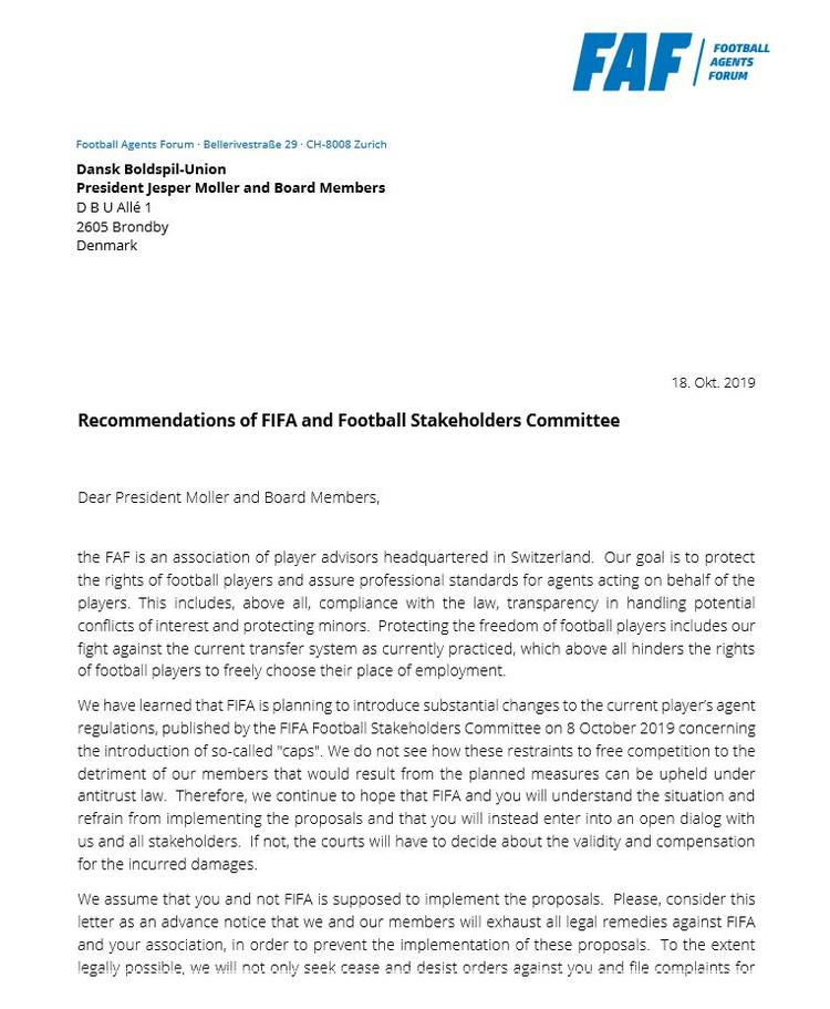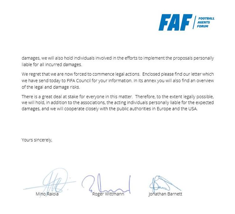 I brevet skriver de på vegne af et selskab, der kalder sig Football Agents Forum. Ifølge dem er det »en sammenslutning af spillerrådgivere med hovedkvarter i Schweiz«, men de angiver ikke, hvem der er medlemmer udover altså dem selv. Mino Raiola står anført som ’præsident’, mens Wittmann og Barnett er ’vicepræsidenter’.