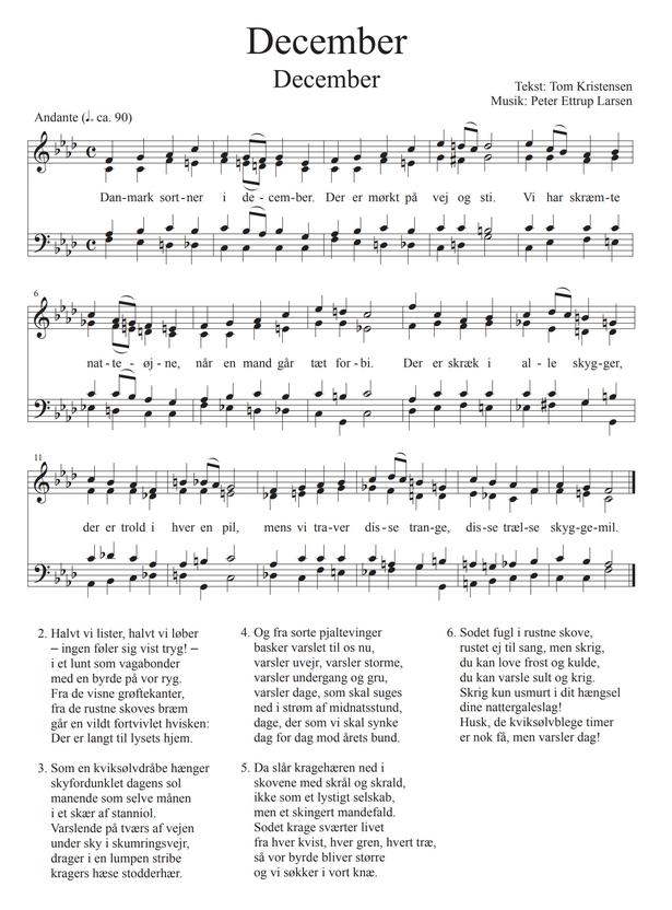 Decembers sang har tekst af forfatter og Politiken-koryfæ Tom Kristensen; originaltitlen er ganske enkelt ’December’, og sangen synes af Coro Misto dirigeret af Søren Birch.