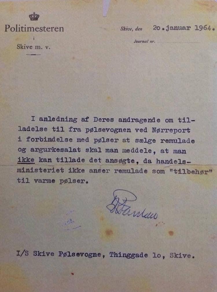 En gang imellem kunne man godt ønske sig, at myndighederne var lige så nidkære som dengang i 60’erne, hvor det krævede særlig godkendelse at anvende remoulade og agurkesalat til hotdogs. Det kunne måske sætte en stopper for brugen af ananas på pizza. Bagsiden, som er stor tilhænger af varme pølser med hele pakken bestående af sennep, ketchup, remoulade, rå løg, ristede løg og agurkesalat, savner i øvrigt udtrykket ’andragende’, som politimesteren i Skive anvender i sit brev til I/S Skive Pølsevogne, som læser Jonas Hald har sendt til Bagsiden under overskriften ’Forbudsdanmark’.