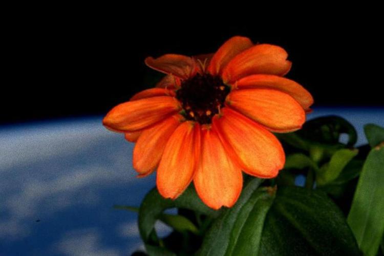 Nu står den nyligt udsprungne plante med 13 orange kronblade og knejser foran det store udsigtsvindue ’Cupola’ med den blå planet som baggrund.