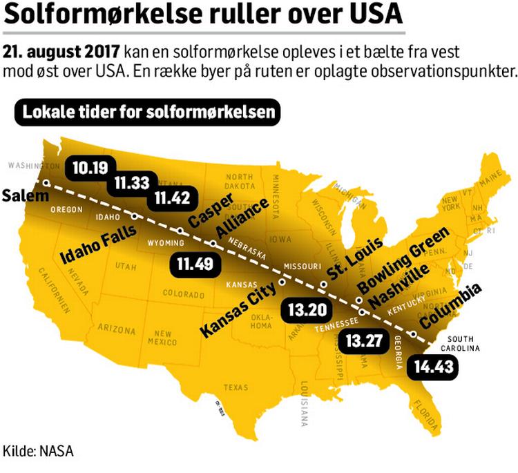 Den totale solformørkelses kan ses på tværs af USA og vil - afhængig af placering - vare op til to minutter og 44 sekunder.