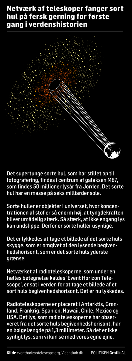 Et internationalt hold af astronomer har i netværket Event Horizon Telescope, som består af otte jordbaserede radioteleskoper placeret på fire forskellige kontinenter, zoomet ind på et supertungt sort hul i centrum af galaksen M87. Den ligger i vores kosmiske nabolag, der befinder sig cirka 55 millioner lysår borte i stjernebilledet Jomfruen.